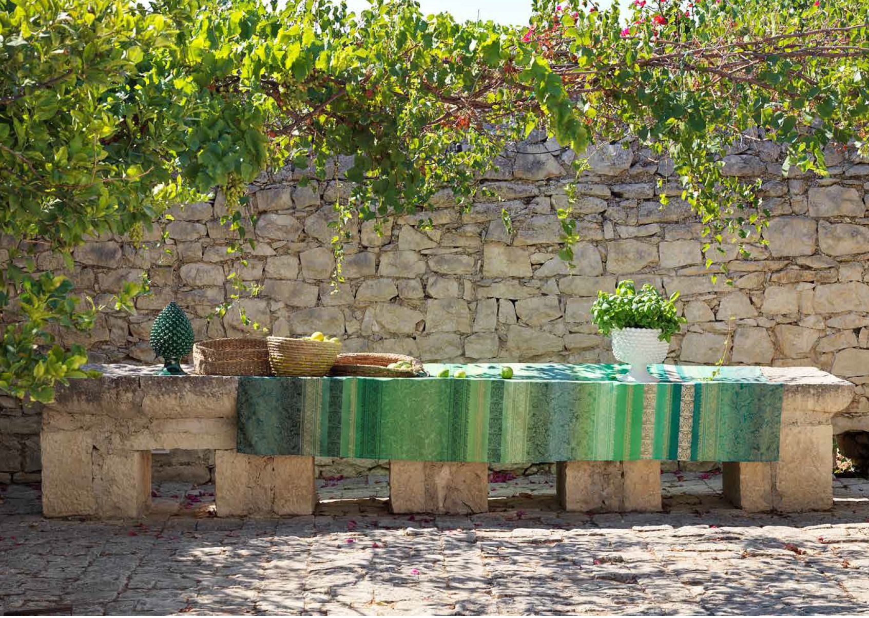Das Motiv ist in Sand- und Perlgrautönen gehalten, die an die warmen Farben der Felsen der Scala dei Turchi und die hellen Farbtöne der schönsten Strände der Insel erinnern. Eine zweite Variante ist in verschiedenen Grüntönen gehalten, eine Farbe, die an die Schönheit der mediterranen Vegetation mit ihren Oliven-, Agaven- und Zitrusbäumen erinnert. Die dritte Variante schließlich wird in den intensiven und leuchtenden Farben der sommerlichen Sonnenuntergänge angeboten, die in ihrer ganzen Pracht von den Salinen von Marsala und Trapani aus bewundert werden können.